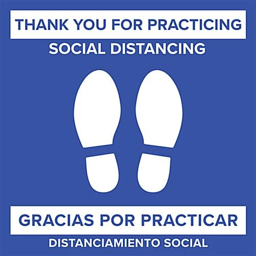 A 24″ bilingual social distancing floor sticker kindly reminds the public to follow important safety precautions. The pre-printed stock messaging reads “Thank You For Practicing Social Distancing” and is also displayed in Spanish as “Gracias Por Practicar Distanciamiento Social”. Use a removable vinyl bilingual social distancing sticker inside retail stores at checkout, or outdoors for curbside pickup. The familiar footstep graphic shows customers where they should stand to wait for services.