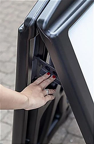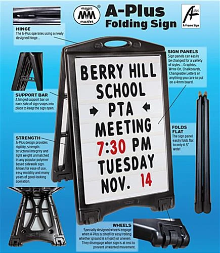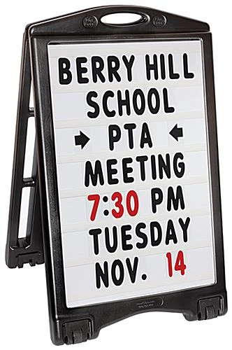 This 24 x 36 A-frame letter board sidewalk sign is a new and improved classic that’s sure to draw roadside attention to your storefront. The four wheels allow for easy transportation over grass and pavement so heavy lifting is never required. Grasp one of the two handles at the top of your collapsible 24 x 36 A-frame letter board sidewalk sign and tilt the unit to engage smooth mobility. Once repositioned and placed upright, the wheels disengage so your signage stays secure on inclines and in heavy winds up to 30 mph, with the option to fill each rust-resistant leg with up to two quarts of water for added weight. Release the two support bars on both sides of your advertising display to reduce the total depth to only 6.5” for discreet and tidy storage after hours. The wide range of black and red characters allows for endless messaging such as school function reminders, salon hours, parking garage rates, or even daily quotes that can easily engage potential customers as they drive or walk by. After easily inserting both white opaque panels to the collapsible frame, apply the 4”H characters to the seven rows of pre-installed tracks with a raised backing to keep your letters firmly in place. The high-quality paint will never fade due to sun exposure so you can reuse for years to come on the sleek, rust-resistant base. Use this folding 24 x 36 A-frame letter board sidewalk sign with wheels for double-sided, outdoor advertising geared directly toward your customer!