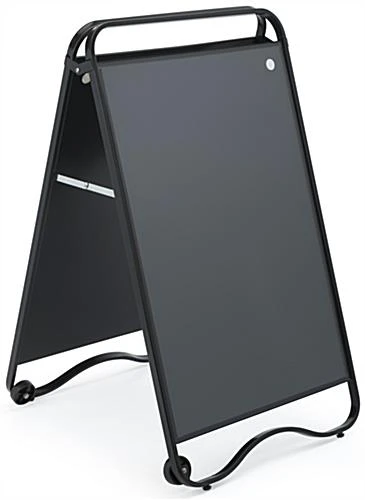 Bring your promotional display curb-side with a rolling a-frame sign! Companies will reap the rewards with a portable sandwich board to wheel outdoor and entice passing foot traffic. Display 24” x 36” signage behind protective magnetic PVC lenses that are receptive to the double sided rolling a-frame. At the close of each business day transport and storage are made easy, collapse the sandwich board and tip onto the 2 base wheels. A powder coated finish atop the steel build provides a durable holder that will withstand years of use. If signage for curb-side real estate is your need, this rolling a-frame will fit the bill for your business!