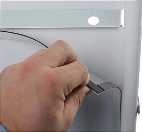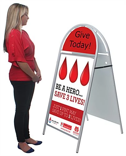 The semi-circle design at the top of this display can also be used for signage. Make custom fitting signs or get a vinyl poster printed at a local graphics shop for these metal a-boards. Draw in customers from the sidewalk with these displays. Use these metal a-boards to post menus, specials, sales and much more. With the magnetic lenses it is simple to change signage in mere seconds. To lift up the magnetic lenses on these metal a-boards simply push your finger through the hole on the back of the board to unseal the magnetic overlay. Add new signage by simply placing a poster in and resealing the magnets. These metal a-boards are a phenomenal accessory for restaurants and retail store.