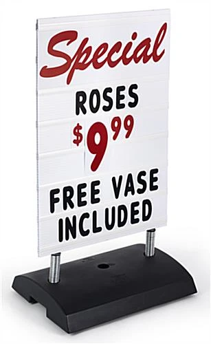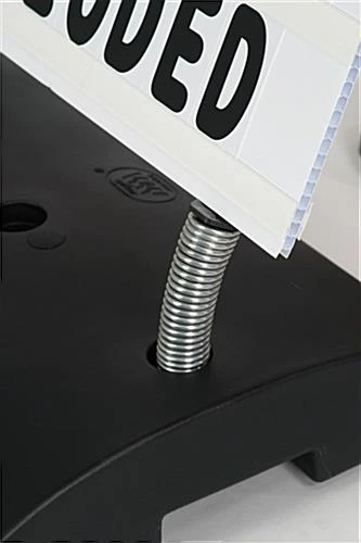 Our sidewalk sign is extremely easy to use and is a very versatile product. Display it indoors, or outdoors because the weather will not affect it. Your sidewalk sign is safe in rain and winds up to approximately 20 mph. The solid construction of the sidewalk springer sign makes it virtually indestructible. With these sidewalk springer signs, the sign itself is made of corrugated plastic and the base is made from heavy duty plastic, which can be filled with sand or water for even more stability.