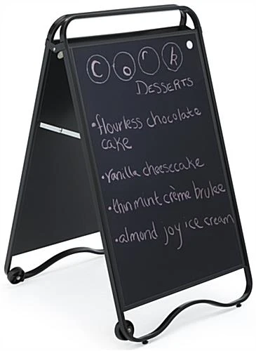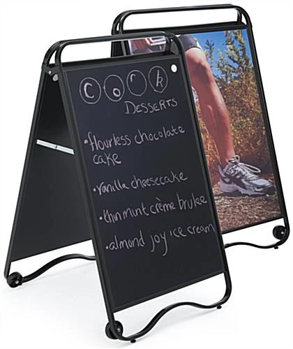 Whether you need a classic a-frame poster holder or a write-on surface, this chalkboard display fixture sandwich board can serve either need! Each side of the pavement sign can showcase a 24” x 36” image or a personalized hand drawn message on the writing area. A magnetic PVC lens snaps firmly around the edges of the a-frame display fixture sandwich board to keep your advertising safe indoors or outdoors. Two wheels on the base of the pavement sign make it easy to roll outside your store, restaurant, or bar. Powder coated steel provides durability without sacrificing a modern style that will last for years to come. Promote restaurant specials, new hours, or advertising on a colorful poster or hand drawn message with this sandwich board that supports dual usage.