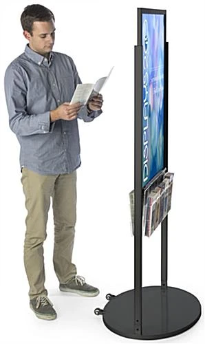 This black 24 x 36 mobile poster display with 10 literature slots for advertisements is a great way to show off your businesses merchandise and services. The sign holder features an acrylic brochure pocket providing an additional way of connecting the content within the advertising graphics with the customer. The moveable poster display has an easy top loading insert in the frame for simple interchanging of your prints. In addition, the panel comes with a heavy duty rolling base that’s easy to move around your business for better product connectivity. The poster display has a sleek glossy black frame with a modern edge which will fit anywhere within your business setting. Each double-sided panel is perfect for promoting your graphics with a signature sign holder to enhance your customers shopping experience.