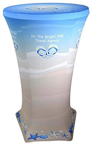 These cocktail table with covers with full color graphics are eye-catching even in high traffic venues. Each spandex party linen is custom printed on all sides, including the top. These promotional throws are cocktail table with covers that are affordable. The low cost of these tabletops with linens will work with any budget. Many customers will purchase these highboy sets in large quantities for use throughout the function hall.