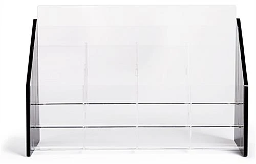 This leaflet holder is ideal for cramped or crowded locations. This fixture holds up to twelve different brochures or pamphlets in one compact unit. Does your company need a leaflet holder to offer various flyers to customers? Do you want a brochure rack with a unique yet effective design? This leaflet holder, also known as a pamphlet stand or leaflet display, is recommended for use in offices, lobbies, community centers, or retail locations. It holds up to 18″ (total), of standard-sized brochures. This flyer rack is a sleek and stylish leaflet holder, sure to complement any décor. The clear front panel and black acrylic sides make for a neutral fixture that blends with any style or theme.