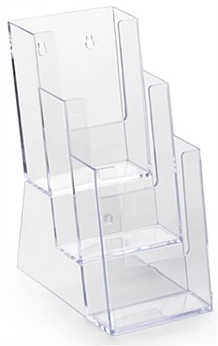 Molded Plastic Three Tiered Brochure Racks- These pamphlet racks are fabricated from injection molded plastic and should be purchased for economic price budgets only, This series of racks are not as upscale as our other hand fabricated brochure racks. Some of these brochure racks have a slight blue tint; manufactured runs are not always 100% optically clear plastic.