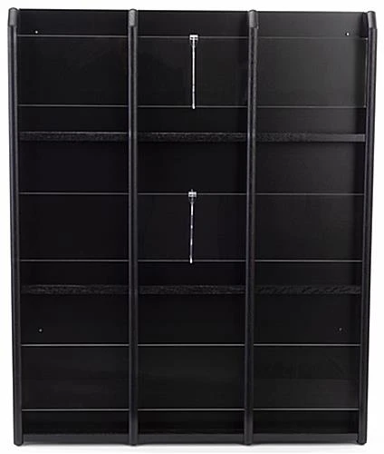 This black finish magazine rack offers a wall-mounted solution to keep reading materials organized and accessible for people to use in waiting rooms, banks, libraries and more. The literature holder is made of durable solid oak wood, ensuring a long-lasting design. This tiered wall-mounted black finish magazine rack ships completely assembled, ready to use, and it comes with 9 optional clear acrylic dividers. The inserts allow you to switch out catalogs for folded brochures when desired and provide an unobstructed view of the literature. Our optional 4″ x 9″ clear acrylic dividers will keep pamphlets from falling out and wrinkling, making it great for your office. This tiered black finish magazine rack adds a stylish yet professional look that will look great in any law firm, healthcare facility, real estate agencies, and more.