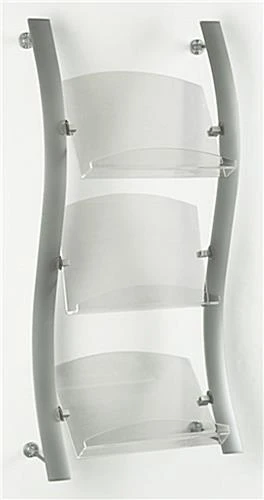 This 3 tiered leaflet holder has a one-of-a-kind, wave-like structure to which visitors will be drawn. Constructed from aluminum, your leaflet holder is resistant to rust when used indoors. The brochure fixture, leaflet holder has a smooth silver coat, adding style to your resilient fixture. This leaflet holder, also known as a wall-mounted panel, is a great organizational tool for offices, retail stores and lobbies. A waiting area, for example, could use this flyer dispenser to share pamphlets and reading materials with waiting guests.