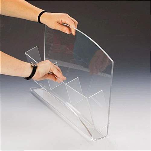 Your leaflet holder features (3) clear acrylic pockets for arranging your takeaway materials. Clear acrylic allows visitors the ability to easily view headlines and titles. The pamphlet dispenser, leaflet holder includes adjustable brackets for each acrylic pocket, giving you the freedom to alter the height and angle of each compartment. This brochure fixture is therefore an adjustable leaflet holder! We provide the 3 tiered leaflet holder with wall-mounting pins already attached to your fixture. This leaflet holder, such as our other wall displays, is a great tool when space is limited.