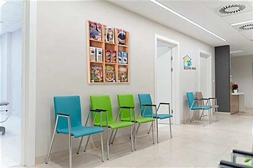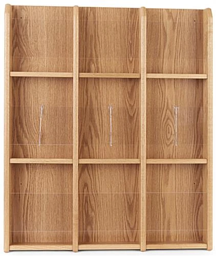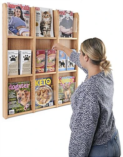 This 3 tier magazine display offers a wall mount solution for organizing reading materials in professional interiors. The frame is manufactured from solid red oak and features a light stained finish. The 3 tier magazine display comes with clear acrylic stops that not only hold the literature upright but also make the periodicals readily identifiable. Want to display other items like folded brochures? Use the optional acrylic dividers to split the pockets into two slots for inserting 4″ x 9″ pamphlets. Our 3 tier magazine display provides traditional styling thanks to the warmth of real wood. Set up a wall rack to keep shared reading materials orderly in waiting rooms, libraries, schools, and much more.