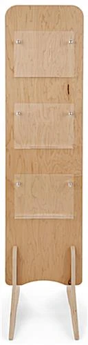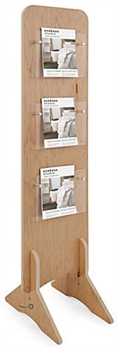 Our knockdown wood literature stand is ideal for displaying magazines and brochures in retail stores, trade shows, showrooms, and more. Each lightweight 3-tier fixture has a fully collapsible build for effortless setup and breakdown within minutes. This knockdown wood literature stand with double-sided display areas features three 11.75″ x 9.5″ acrylic dividers on each side that, when paired with eye-catching reading material, will be sure to grab the attention of passersby coming from either direction. The clear pocket compartments on this unit are 1.5″ deep to ensure magazines and brochures stay securely in place. Standing at 66″ tall and 15.5″ wide, this knockdown wood literature stand with narrow design can showcase an ample amount of reading material while taking up minimal space on your selling floor. Reinforced with protective plastic feet, easily move this collapsible 3-tier fixture around for merchandising updates without subjecting the floor to scratches or scuffs. Arrange your best marketing material on this modern double-sided plywood display to create a compelling showcase for guests to browse through with ease!