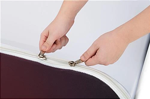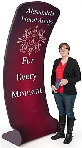 Whether you need an impressive stand for your next trade show or are looking to enhance an in-store promotion, this custom curved fabric display is a great fit for any venue. The large frame is designed with bends to create a look that, while offering plenty of smooth space for displaying logos and messages, still captivates passing crowds with its unique shape. The serpentine fabric display features custom banner printing that uses long-lasting dye sublimation for brilliant artwork. Due to the nature of the high-tension fabric, the graphic stretches tight over the entire frame for a taut and professional appearance. The provided art template helps guide you during the banner printing process, such as providing dimensions for the ideal viewing area to take advantage of where to place artwork in relation to the curves. This portable fixture is ideal for a trade event, as the aluminum poles break down and pack away neatly in the carrying bag for transport and storage. This fabric display is offered at an affordable price to create a one-of-a-kind fixture for any booth!
