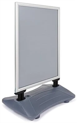 These portable message boards, side walk signs feature wheels and a hidden handle for quick & easy transport from your business to the side walk. A gray reservoir base can hold approximately 8 gallons of water, giving the side walk signs a lot of extra weight to stand up to windy conditions. Spring connectors between the water base and snap frame, provide additional wind resiliency. The side walk signs’ snap open frame is a great feature, as well. The double-sided 30″ x 40″ snap frame expands the scope of your advertisement, while allowing quick message change out. The snap frame of these side walk signs also features protective, non-glare PVC lenses for the safety of your advertisements, and rubber gaskets to ensure your message stays dry, even in wet weather conditions.