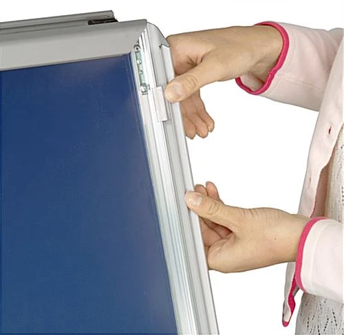 We sell this A-frame with 4 snap-open sides on each of the 2 sides, for easy loading and unloading of posters. The 2-sided folding A-frame is held together by 2 spreader hinges, which make it very simple to fold open and close. A-frame signs, sidewalk signs, sandwich boards and other temporary signs are constructed from lightweight aluminum to make it easy to transport to and from locations. Buy this A-frame sign online and start luring customers to your business!