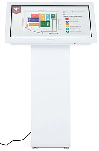 Deliver dynamic messaging with this white touch screen monitor kiosk that features a multi-touch 10pt IR 32” panel and 1080p resolution for sharp images and text. Upload content to this slanted digital signage unit with the plug-n-play design using the available USB port or via a personal cloud storage account over WiFi. This white capacitive touch screen monitor kiosk display offers an interactive solution that promotes customer engagement and is perfect as a wayfinding directory on a campus, menu board in a restaurant, building directory or lobby display. The large scale 32” WLED monitor features a 1400:1 contrast radio, 450-nits brightness, and 89/89 viewing angle. This display unit also features an Android operating system, 2GB of RAM, and 8GB of internal storage for ease of marketing content loading and maintenance. Enhance your multimedia content with this WiFi device that functions with a simple touch of your finger, making it the ideal digital signage advertising fixture. When paired with properly developed content, this touch screen monitor kiosk can provide your establishment with an interactive display to enhance your customers’ experience.