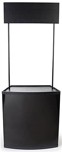 The demonstration counter comes in a sleek black design, allowing the display to stand out against any background. The tradeshow booth has a generous amount of countertop space for several promotional items to be displayed. This demonstration counter is sturdy enough to hold several items on each shelf and countertop as well. The portable tradeshow exhibit booth weighs just 14 lbs. The demonstration counter is relatively inexpensive when compared to other similar exhibits. The promotional booth with a header is great for giving one-on-one advice to customers about products at a tradeshow. Each countertop that comes with a header is excellent for tradeshows, exhibits, and promotional events at stores or business presentations. This display is an easy way to get word out about a new and exciting business or product The booth is cheap, portable, easy to assemble and lightweight. All of these features make this the perfect choice for any business to use at the next tradeshow!