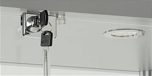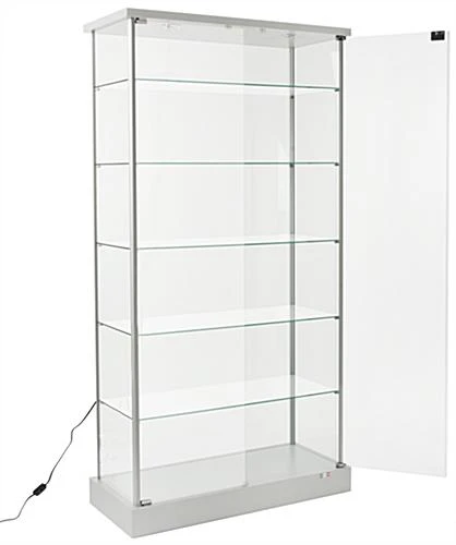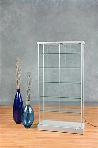 This glass display cabinet provides an alternative store fixture in the form of a contemporary curio case. Design a custom retail arrangement on the (5) height adjustable and removable shelves. High quality items are safely locked behind (2) swing open doors within this free standing display cabinet. Showcases are an ideal alternative for corner cases or sample tables as the retail merchandise can be exhibited elegantly for customers to view while remaining cautiously behind panels preventing tampering or damaging. Additionally, the double hinged doors provide easy access to products arranged inside while stocking the shelves and making a sale. High quality showcases, also known as trophy cases, create an impact with (2) LED recessed lighting fixtures located in silver veneer canopy top. Concealed beneath the base are (4) casters, providing portability to the display cabinet. No matter the merchandise locked within a floor standing case, the simplistic design of the EuroVū series will complement it well.