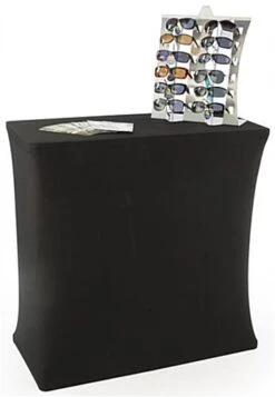 A portable counter and case could be the most important asset to your trade show display. The travel kit has wheels for easy transportation and is formed with a hard plastic container to keep your stand safe during travel. The ultra-light portable counter is extremely easy to build and has a sleek professional look for any occasion. The bottom part holds any accessories that you might want to hide and is still easily accessible with a 24” zipper in the back. The portable counter includes a black stretch cover. While the case is full of parts for travelling, there is still 3/4 of the casing empty for any other products you may have. Overall the trade show display stands 38.5” high and has plenty of room for showcasing any object.