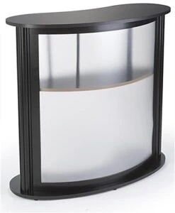 This modular trade show counter is the ideal portable display to have at your next promotional event. Equipped with a black top, shelf, and base the kidney shaped table has an overall width of 41” and stands 38.75” in height. The trade show counter for retail use provides an easy presentation solution to take to your next convention with the knock down design and travel bag for efficient transportation. The portable display table is manufactured with an aluminum extrusion and two PVC lenses to add your own custom graphics. The trade show counter is the perfect solution for advertising new products with its sleek design. Use the top of the console to highlight featured merchandise to get a leg up on the competition for a presentable demonstration!