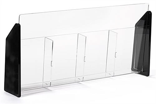This flyer stand features a classic design that is suitable for any upscale environment. With 4 non-slip rubber stoppers, this literature holder is an acrylic brochure display, perfect for any public countertop area. This flyer rack is commonly seen in travel agencies displaying pamphlets for popular vacation destinations. With the front panel made of a clear acrylic, this literature holder, brochure display protects each pamphlet while still presenting the material clearly. Curious onlookers do not need to lift the reading material out of the pocket in order to view the entire cover. This brochure display, also known as a literature pocket, has two sides made of 3/8″ thick, gloss black acrylic. This is what gives the flyer holder its elegant appearance. This brochure display is the perfect acrylic rack to distribute your materials and more importantly, your message.