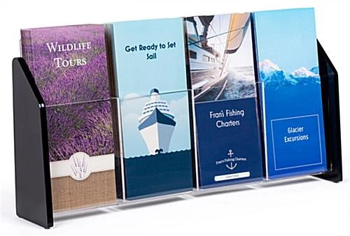 This modern brochure display is an ideal literature holder for areas that have limited wall or floor space. Use this flyer rack to present materials in an eye-catching manner. Are you shopping for a modern brochure display to showcase several different flyers in one unit? This rack allows users to display four different pamphlets or large quantities of the same handout. This literature holder, contemporary brochure display exhibits pamphlets in an orderly yet attractive manner. Banks, restaurants, hotels and car rental agencies often buy this flyer rack to place on countertops. This brochure display, such as the 2-pocket literature holder and 3-pocket flyer rack, is an effective marketing tool for a front lobby desk, in an exhibit booth or within a showroom display.