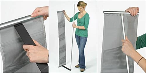 This magazine stand is made of lightweight and durable gray mesh. The magazine rack, also known as a magazine stand, has four pockets to display your literature in. This magazine display features metal bars in between its pockets to keep the literature rack with crisp edges and a professional appearance. We sell this magazine stand with a durable black carrying case that has a handle for easy travel. These magazine stands also come with a silver tension rod and metal top and bottom bars. We also sell this magazine stand with a slip resistant metal footing piece so your literature rack stands firmly in its place.