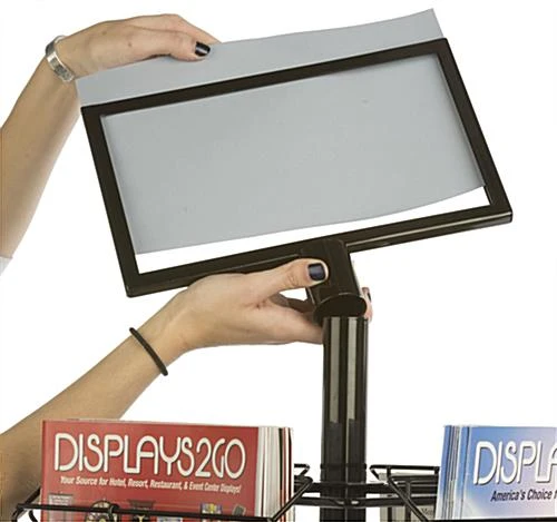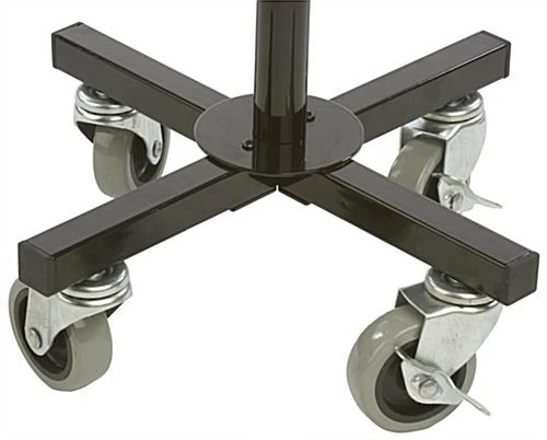 This standalone literature carousel is comprised of 4 tiers that spin individually, allowing multiple parties to view a large series of print materials simultaneously. Available with partition dividers, each brochure stand accommodates differing sizes of handouts by a simple lift of an attached peg. Neatly stack 8.5” x 11” sized magazines or 4” x 9” brochures within the full or half gauge sections of each literature carousel with 16-32 pockets. Removable casters and a top header provide mobility and available signage space for sales, specials, or deals to be advertised. Ideal for pharmacies, retail store, lobbies, and waiting areas, each brochure stand can be used as a portable or stationary unit depending on whether the provided levelers or 3″ wheels are used. Series of leaflets, handouts, catalogs, maps, magazines, and flyers can all be neatly displayed in the pockets provided with the literature carousel manufactured from durable black wire with a knock down design.