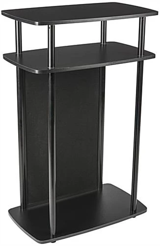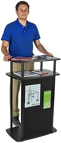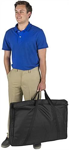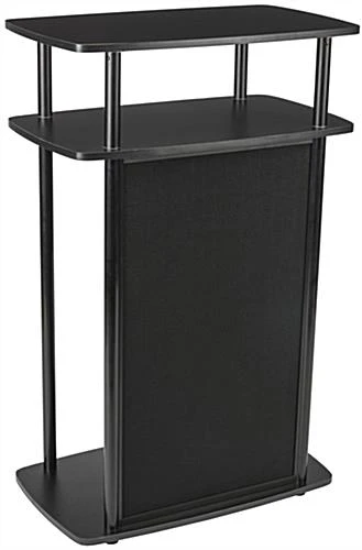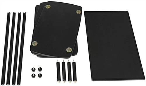Use this exhibit counter with hook and loop front to create a stunning display that grabs a passerby’s attention. Aluminum poles and MDF board give this stand a professional look that will last through years of high traffic events. Each black counter features an inner shelf for keeping additional products or personal items organized. The portable design and included canvas carrying bag allow this stand to be moved to different events with ease. Stand out by adding signs and other accessories to your front panel. Get a counter with portable design for your next big conference or event and feel confident in your purchase for years to come.