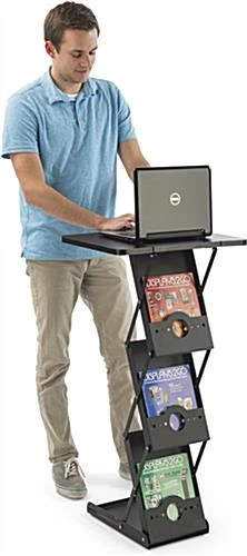 This folding literature counter is a fantastic promotional aid that doubles as a magazine stand and work space. With 3 standard size periodical pockets and a 20” wide table top, the display rack is a necessary portable accessory for trade shows and exhibits! Included with the promotional counter is a hard cover travel case that locks for easy, organized, and safe travel. Set up is fast by simply lifting the display rack into an upright position accordion style and locking the pins in place. The stand ships fully assembled! Showcase magazines inside the pockets and use the counter as a space for a laptop or product samples. The portable brochure and periodical stand is constructed of durable steel and MDF materials for long lasting use.