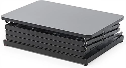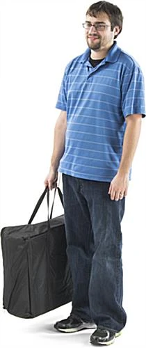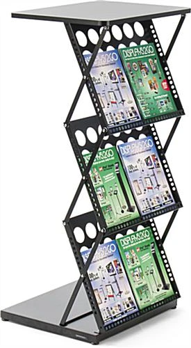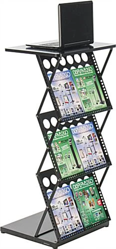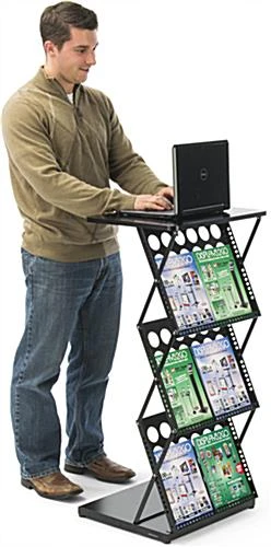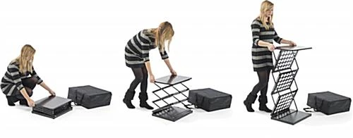 This portable literature counter is a 40” tall pop up display for trade shows. Set up the pre-assembled unit in seconds by pulling the stand upright and locking in place. Have a ready-to-go exhibit counter for all of your trade show needs with the magazine rack that includes a vinyl carrying bag for easy and organized transport. Display an abundance of periodicals on the 3 double wide shelves to promote company products and services. Use the 20” wide tabletop of the counter to showcase different samples or transform the stand into a work space for laptops and customer interaction. The pop up lectern brochure stand for exhibit use ships flat to save space and minimize shipping costs!