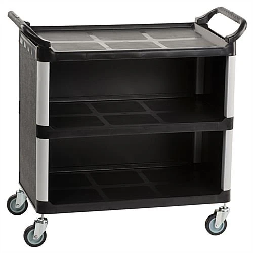 The heavy duty hand truck, three shelf utility cart provides a plastic rolling unit for commercial environments. This dolly is an ideal piece of equipment for the food service industry. The three shelf utility cart that has dual handles for bussing allows tables to be set and cleared efficiently. The enclosed shelves maintain an attractive and discreet unit for use in the dining area of the restaurant or in the back kitchen. The three shelf utility cart that is constructed from black polypropylene plastic allows for easy cleaning and durability. The supply carrier is manufactured with rounded corners to eliminate the potential for wall damage if accidentally hit. The three shelf utility cart features two handles. Each easy grip handles are designed to make steering manageable and accessible from both sides. The three shelf utility cart that has swivel casters for easy maneuverability provides effortless mobility and added elevation. These mobile hand trucks provide a portable unit to easily transport a surplus of materials at once and are available in two sizes. Each multi-purpose trolleys, three shelf utility cart is shipped unassembled and a rubber hammer is required for set up.