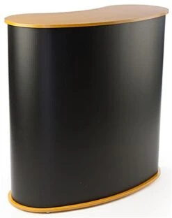 These exhibition counters provide an area for trade show exhibitors and attendees to interact. The furniture is also great for product demonstrations or as a “free sample” kiosk at retail outlets. The exhibition counters for sale here, also known as portable displays, can stand alone or be placed within an existing trade show booth. The black sidewalls with wood-grain base and countertop coordinate with many existing booth setups. These exhibition counters that include a convenient carrying system are versatile and designed to last for years. The displays are lightweight for easy transport between events.