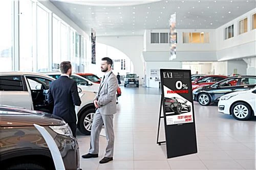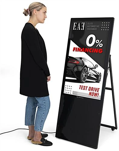 This digital sandwich board is a sleek advertising signage solution for your retail store, café, car dealership, trade show, and more! This modern A-frame has an Android 7.1 OS and a 1080p 43″ screen, providing you with a high-quality display for your in-store promotions, menus, product videos, and more. This portable digital sandwich board has a collapsible piston hinge design making it easy to store away and move around. The back of the A-frame unit features two wheels on the base and handles on the top for simple maneuverability around larger spaces like department stores and convention centers. Access your content with ease with USB, HDMI, WiFi, and Bluetooth options, making it easy to access content on a computer, hard drive, or in cloud storage. Instantly improve your picture’s or video’s exposure, saturation, highlights, and more using the pre-installed DiViEX Slide Show App for an elevated advertising signage experience. This portable design also features casters and rubber foot pads, keeping the unit firmly in place in high traffic environments. This collapsible digital sandwich board will elevate your store’s advertising with impactful multi-media content that will effortlessly grab passerby’s attention.