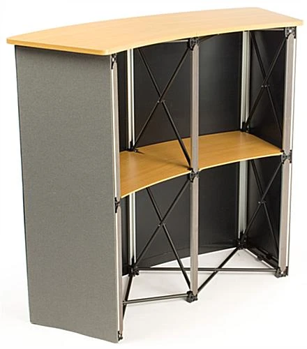 This pop up exhibit, trade show stand weighs only 30 lbs. when loaded into its convenient backpack-style carrying case. The trade show stand features easy 2-4 minute setup. To setup your stand, simply pop open the trade show stand’s lightweight, but sturdy, aluminum frame, attach magnetic rods, magnetically affix hook fabric panels to the booths, add inner shelves and top counter area. The trade show stand features gray hook-style fabric panels, so literature holder accessories with nylon hooks are easily attached, removed, and reattached as often as necessary. The inner shelves are perfect for storing supplies, product samples, and more.