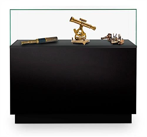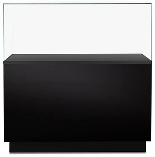 This frameless glass display cabinet features a modern black base made of eco-friendly FSC-certified CollinsWood®. The counter features a 17″ tall break-resistant, tempered glass lift-off top with a keyless air cylinder pneumatic locking system that does not require an electrical outlet. This locking system seals the top onto its base, keeping it tightly secure and locked, perfect for high-end retailers and museums. The stunning showcase is airtight and dust resistant, with silica gel bags in lockable compartments to ensure preservation and protection from moisture. With dimensions of 48″W x 47″H x 20″ D, this luxury fixture is an excellent option for showcasing high-end collectibles and valuable merchandise items in jewelry stores, galleries, or museums. The unit has a beautiful laminate finish, levelers for uneven floor surfaces, and a 4″ toe kick, creating a clean, polished look at its base. This exquisite frameless glass display cabinet is a show-stopping piece that will attract customers to your featured items in any gallery exhibit, showroom, lobby, or retail store.
