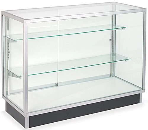 cabinets are a smart alternative to traditional annealed glass display cases. These retail display cases are much more durable, breaking less often than traditional merchandising cabinets. However, if there is an accident, they will break into small, manageable pieces. These retail display cases, glass cabinets also feature clear-coated aluminum extrusions, a recessed black kick plate, and sliding, locking rear doors.
