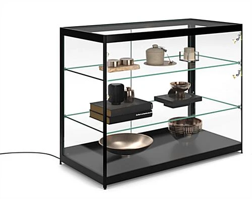 This aluminum display case counter is great for jewelry, pocketbooks, or memorabilia. The cabinets include 4 LED side lights for a more eco-friendly way to illuminate your merchandise. The tempered glass display counter also has 2 adjustable shelves to accommodate items that are larger in size. To adjust to uneven surfaces the cabinets are equipped with foot levelers to maintain a stable structure. The display counter includes sliding tempered glass doors with a key entry push-in lock to keep your items safe from theft. Place your jewelry in the curio to bring attention to your store and to show your customers which items are featured!