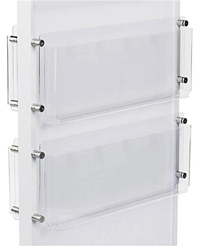 This brochure and magazine holder totes a classy acrylic build. The literature rack has 5 pockets to promote your media in a variety of sizes. The adjustable brochure holder’s acrylic design fits perfectly with the compatible SSAP and DSAP wooden poster stands. Each literature rack comes with removable silver standoffs allowing the unit to be easily assembled and disassembled. The display also has changeable pegs allowing you to quickly turn it into a magazine holder to showcase larger media. Check out Displays2go’s compatible stands today to better utilize your promotional and informational resources!