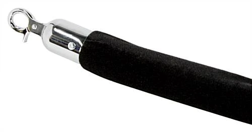This velvet rope, rope barrier features two polished chrome ends with a heavy-duty clip to secure the rope to your barrier post. The actual rope is crafted from a thick foam core with beautiful black velvet covering. The rope barrier has a diameter of 1.65 inches and measures 78″ long, the perfect length for positioning posts 6′ apart. (for safety reasons, the lowest point of your rope should hang at just about 24″ above the floor). This upscale rope barrier is sure to keep large crowds in order or protect displayed items with style and elegance. If you have already purchased a rope barrier system, buying this black velvet rope may offer an inexpensive way to freshen up the look of your space!