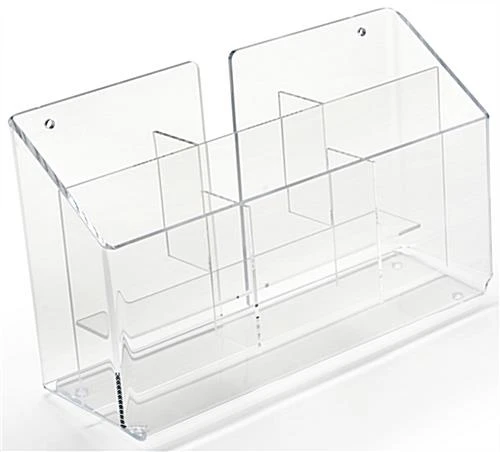 This literature rack is designed to be used as a wall mount or a countertop unit. It has rubber feet to prevent marking of your counter, it also has rear mounting holes so it can be hung from the wall. Pockets are 2″ deep and designed to accommodate standard 4″ x 9″ brochures. The overall literature rack display dimensions are: 13″wide x 7″high and the front panel is 5″ high. This brochure holder is great as an acrylic brochure display, countertop holder, or as a bank display.