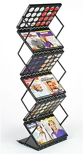 This magazine holder features a lightweight 6 pocket, portable and collapsible design. This magazine holder, also known as a literature rack, is perfect for tradeshows, conventions, traveling sales presentations, and more. Opening up with an “accordion-like” mechanism, this magazine holder expands to full size in under a minute. Simply pull up from the top of the display and lock it into place. You can choose from any one of 3 adjustable heights depending on your needs. With 6 pockets (3 on each side), this magazine holder can display a wide variety of pamphlets, catalogs, and brochures. Your media can be displayed on one or both sides of the stand.