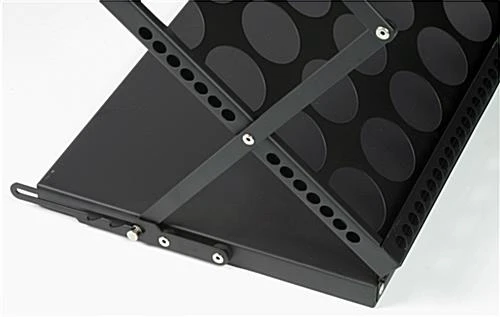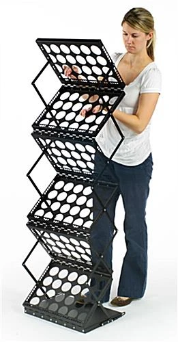 This pamphlet rack, magazine holder features a stylish, “hollow-hole” design with a black finish. This gives the magazine stand a contemporary look and eliminates unnecessary weight. Made of metal, this magazine holder is durably constructed, yet lightweight for easy travel. Each magazine holder features six extra wide media pockets. You can display one 17″ x 11″ piece of literature, or two standard 8 ½” x 11″ magazines side by side. Perfect for tradeshows and people on the go, this magazine holder folds up tightly into its included canvas carrying bag.