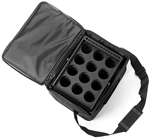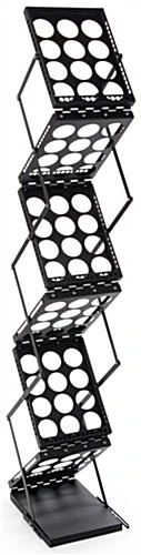 A trade show favorite.This literature holder features a lightweight, portable, and compact design. When needed, this literature holder expands to full size in under a minute. It opens up with an “accordion-like” mechanism to snap into any one of the 3 adjustable heights. Made of steel with a black finish, this literature holder is durably constructed. A stylish hollow-hole design looks great and eliminates unnecessary weight. Use this literature holder to display magazines, catalogs and brochures. Your literature can be displayed on one or both sides of the stand. Perfect for trade shows and people on the go, this literature holder easily folds up into its included carrying bag.