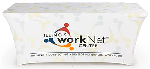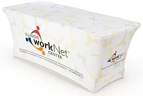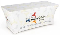 These table covers are designed to snugly fit standard 6’ counters. The linens offer full coverage to provide hidden storage space for booths, which can be accessed using the back zipper. The table covers have 4 pockets that attach to the counter legs for a secure hold. These stretch linens are wrinkle resistant, so presentations will always look neat and tidy. The table covers are sold with full bleed, full color printing over the entire cloth. Use these linens to create a completely custom presentation for your next trade show, marketing event or convention.