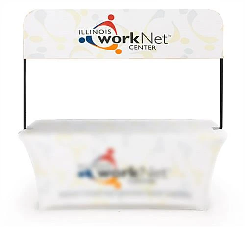 Use this display in combination with a skirt or runner to make an appealing setup. This table header that has custom graphics allows users to print a different image on each side. Easily flip the banner around to display a different graphic! This exhibition table header has either a 24″ or 48-1/2″ gap between the table and the top of the banner. The graphics itself is 19″ tall, giving trade show employees plenty of space to hand out pamphlets and speak with potential clients or customers. The frame of this custom graphic display, table header for tradeshows expands to 8′, so additional graphics can be purchased as well. With a variety of uses and ways to adjust, this display is ideal for promoting at exhibitions. Use this table header to improve any trade show setup today!