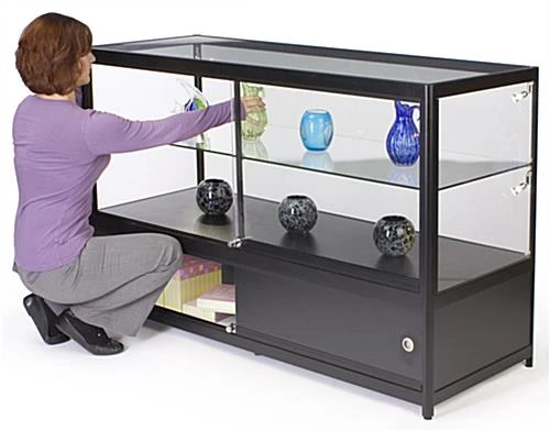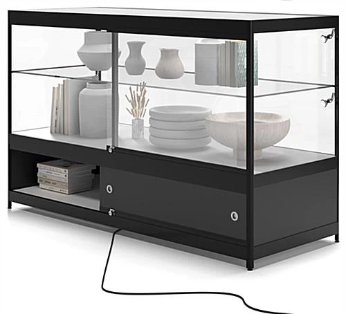 A lighted glass display counter will add extra storage to your retail outlet or boutique. These store fixtures have a modern style and will complement any existing décor. Equipped with 4 side-lit LED bulbs, the contemporary display counter is a cost-efficient way to highlight your items. The retail store fixture has one adjustable glass shelf so that you can modify the height to accommodate larger merchandise. This display counter is part of the Essentials line which can be combined with others in the series to create one continuous structure. The bottom of these units features storage bases with locks to keep your items secure and out of sight.