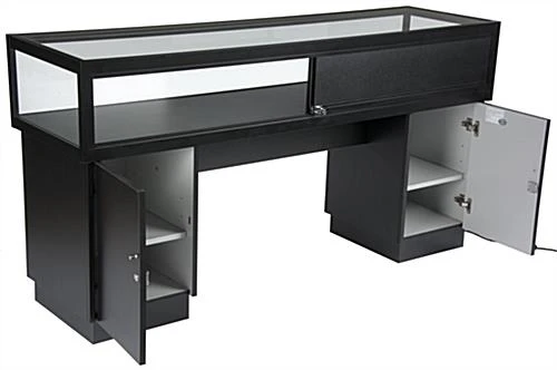 This locking jewelry display case is a perfect addition to your existing store fixtures. With a warm colored LED lighting system, each showcase softly illuminates your products while the tempered glass allows for easy browsing. The counter display case is made with a black aluminum frame and is set on a medium-density fiberboard base that will last through many busy sales days. This showcase also has a cut out for a customer to comfortably sit down and explore your products. Each preassembled unit comes with installed LED ights strips along the interior top, as well as a key to lock both the counter and the two black storage areas for added security of your valuables. This display case, designed to function as a sit down unit, can also be coordinated with other store fixtures for a beautiful, multidimensional showcase for your products.