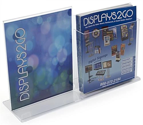 This sign display, also called a literature holder, features an acrylic magazine pocket that is permanent affixed to the base of the unit. This advertisement stand holds flyers or pamphlets that are 8.5″ wide. The sign display with a magazine dispenser is an effective marketing tool that is often seen at reception desks and entryways to promote commercial services. The brochure pocket is 1.75″ deep; allowing users to offer a large quantity of standard magazine-size materials. This sign display is popular with travel agents who use the frame to highlight a tropical destination, while offering free literature for customers to take home and read about vacation destinations. This point of purchase signage holder is an effective promotional presentation tool and great as a countertop display. This sign display keeps desktops and common areas looking neat and organized.