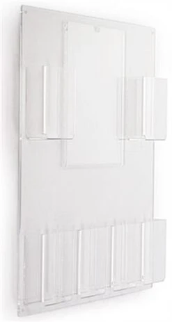 Our wall mounted sign holder with brochure holder combine an 8.5″ x 11″ clear acrylic sign holder (with top notch to allow for easy changing of graphics) with (6) 4.125″ w x 1.5″ d pockets. All-in-one design. Mounts with just four screws and anchors. All mounting hardware included. Overall dim. 22.75″ high by 20″ wide.