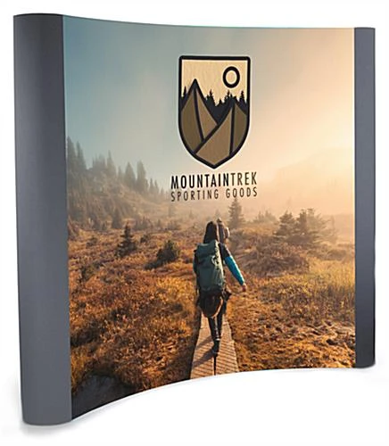 This curved expo wall includes a customized banner that will boldly display your brand at 88” high, making it ideal for crowded trade shows. Each includes a heavy duty plastic carrying case set on wheels to easily transport the frame and graphic panels to every exhibit. This customizable expo wall includes 3 digitally printed PVC panels with a virtual 1200dpi resolution, making sure your personally designed banner is of the highest quality. These panels will not tunnel or separate and do not require a laminate, making this perfect for the traveling entrepreneur. Each expo wall has dark gray end caps that act as a frame to center your design and are made from hook and loop fabric to easily attach the graphic panels. This easy to set up pop up display will create an attention grabbing backdrop for your presentation that average trade show booths can’t give you and is sure to get the attention of soon-to-be customers.